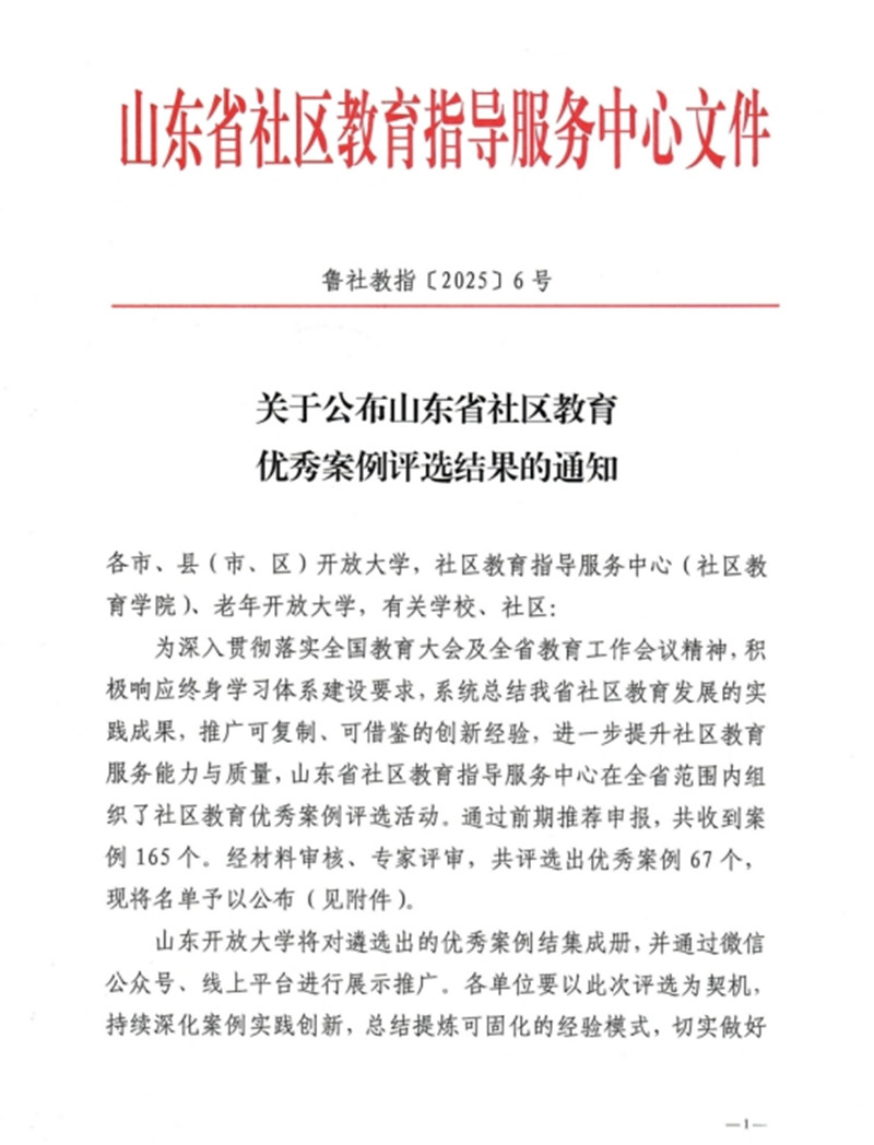 近日,山东省社区教育指导服务中心公布山东省社区教育优秀案例评选结果,我校申报的《家校社共育赋能社区实践》案例从申报的165个案例中脱颖而出,入选2025年山东省社区教育优秀案例。